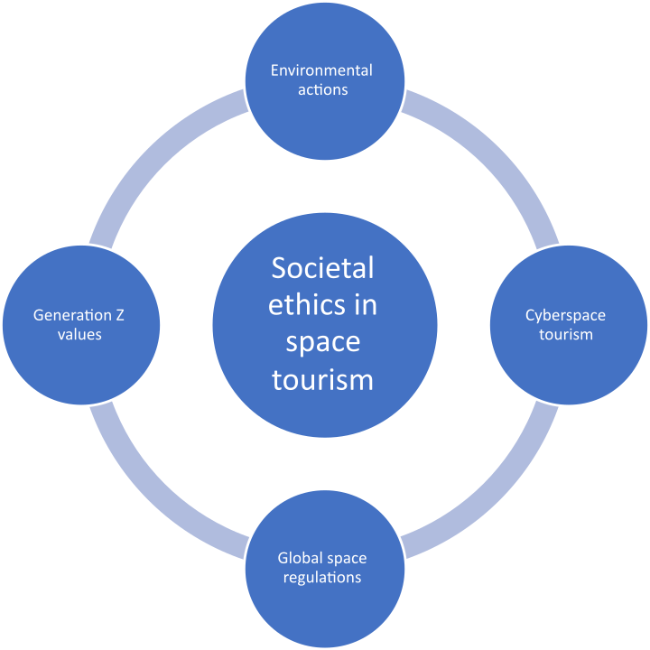 The recent emergence of the tourism sector in the New Space industry, that provides commercial alternatives to publicly funded “Old Space” operations, fits within other societal trends enhanced by technological developments. There are several possible forms of space tourism and, within each, a growing number of competing space tourism ventures will emerge over time. However, whilst the New Space tourism industry is to provide a tourist with new travel experiences, international climate reports urge for more sustainable operations in all global industries. Therefore, climate change preventing solutions must be sought to decrease any unnecessary impacts caused by this new adventure sector of tourism from the beginning. As there are different variables to consider in the formation of future New Space tourism operations and strategies, this paper also illustrates a new framework of “Societal ethics in space tourism”, involving concepts attached to New Space tourism sustainability; environmental actions, global space regulations, cyberspace tourism, and Generation Z values.